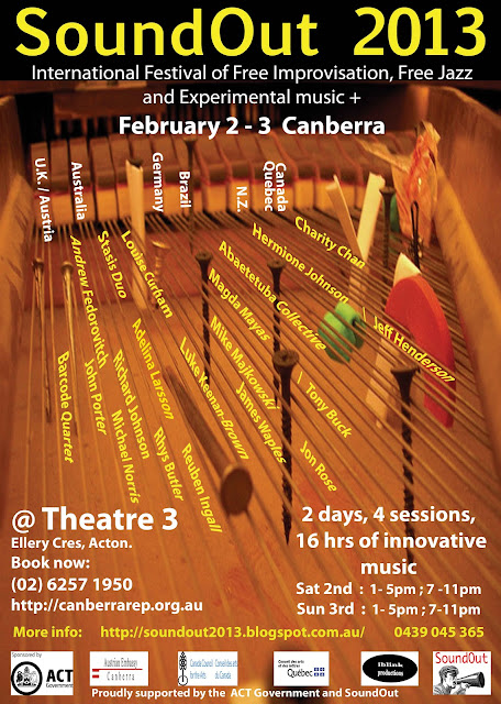SoundOut 2013 is very grateful for the continued support from the ACT Government, as well as the BMA magazines, iblink Productions and SoundOut and the volunteers that help with the festival. Unfortunately at this late stage Adelina Larson has had to cancel her appearance and we welcome Alison Plevey as her replacement. Charity Chan due to lack of communication and personal circumstances could not make it.